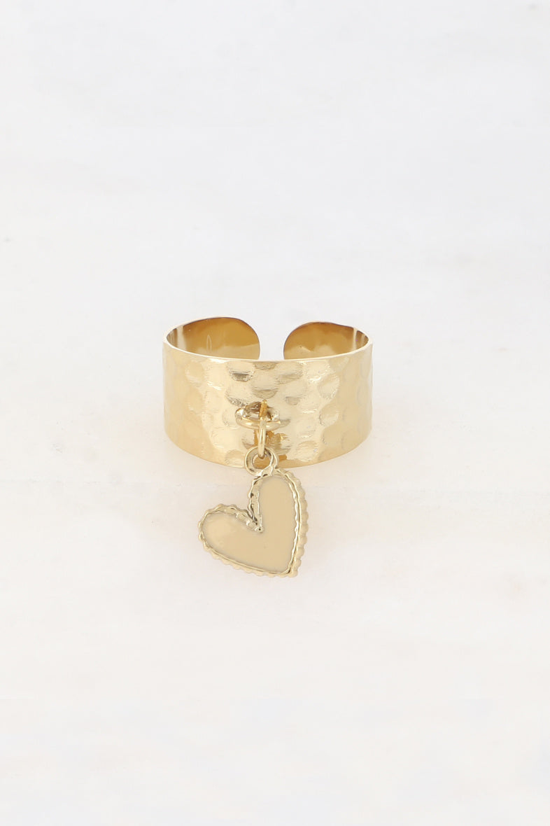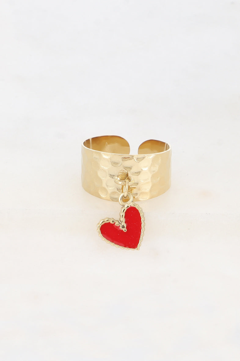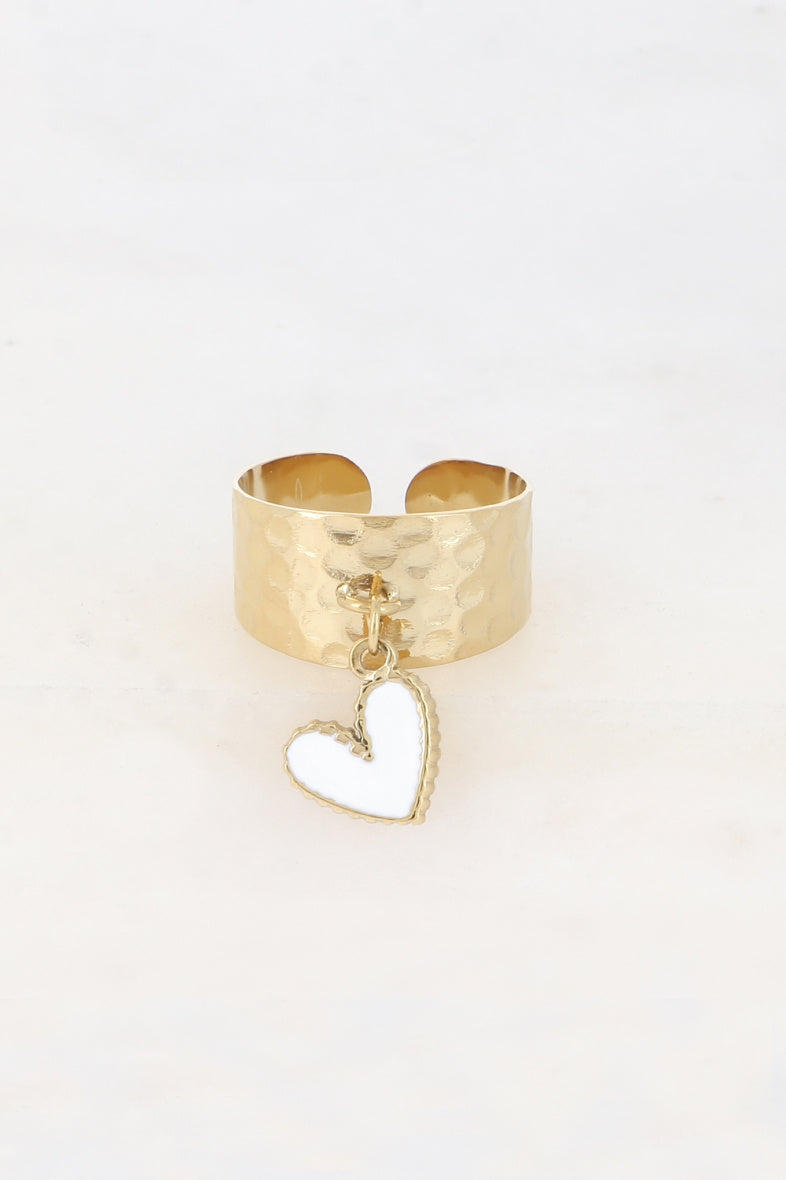 - Bague large composée d'un anneau facetté et d'une pampille en forme de coeur en émail.