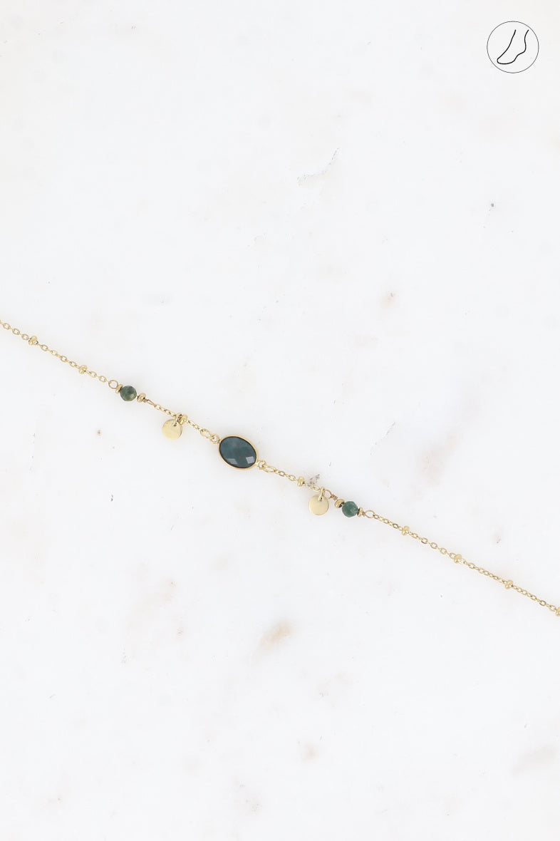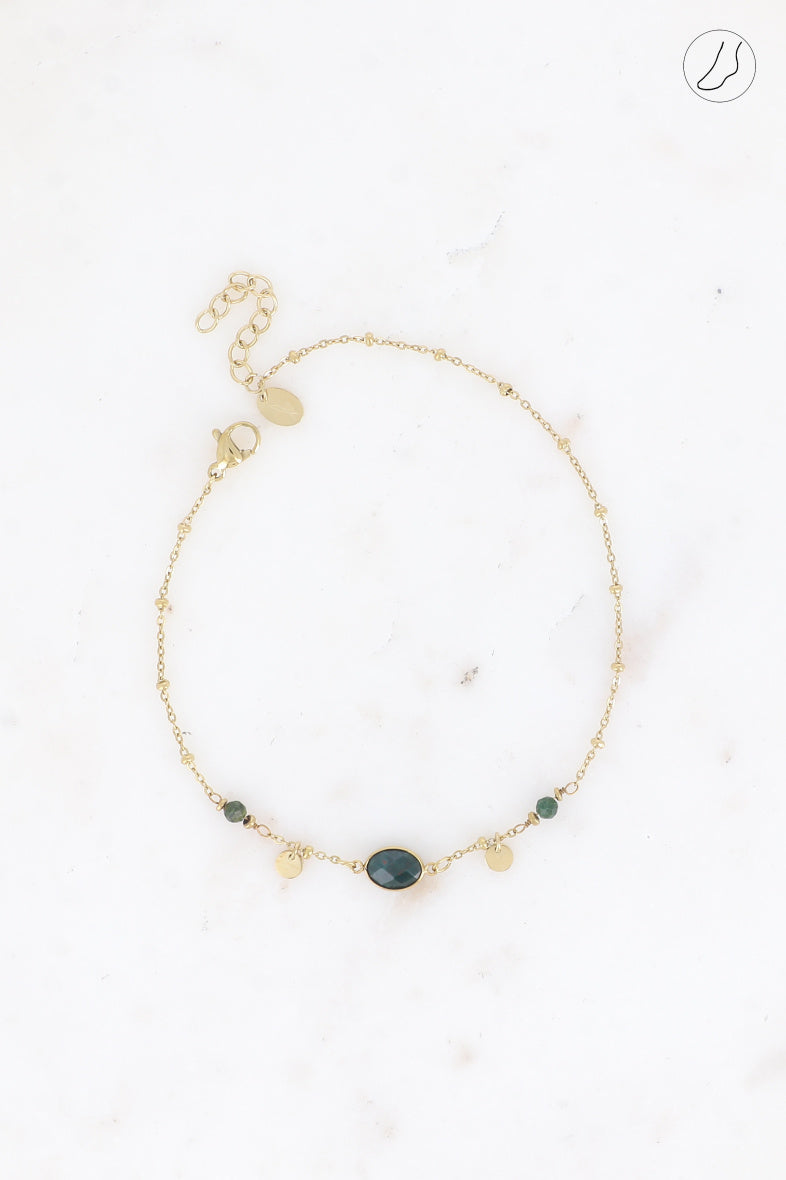Bracelet de cheville composé d'une maille forçat avec des boules, orné des pampilles rondes, de pierres et d'un pendentif ovale en pierre naturelle.